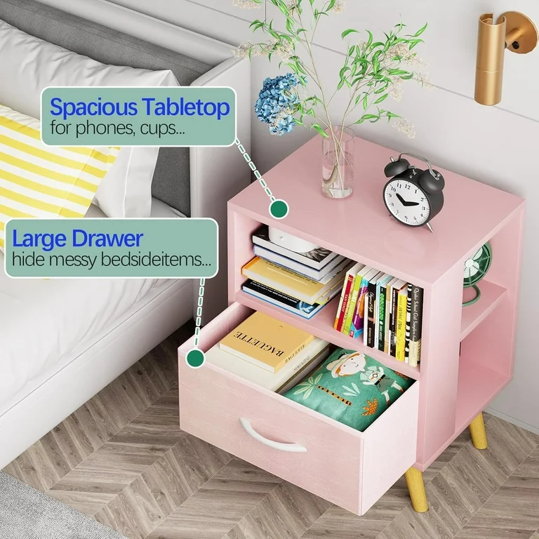 Cute and colorful kids night stand with storage, combining a spacious tabletop, large drawer and open shelves to keep books, toys and bedtime items neat, safe and easy to reach.