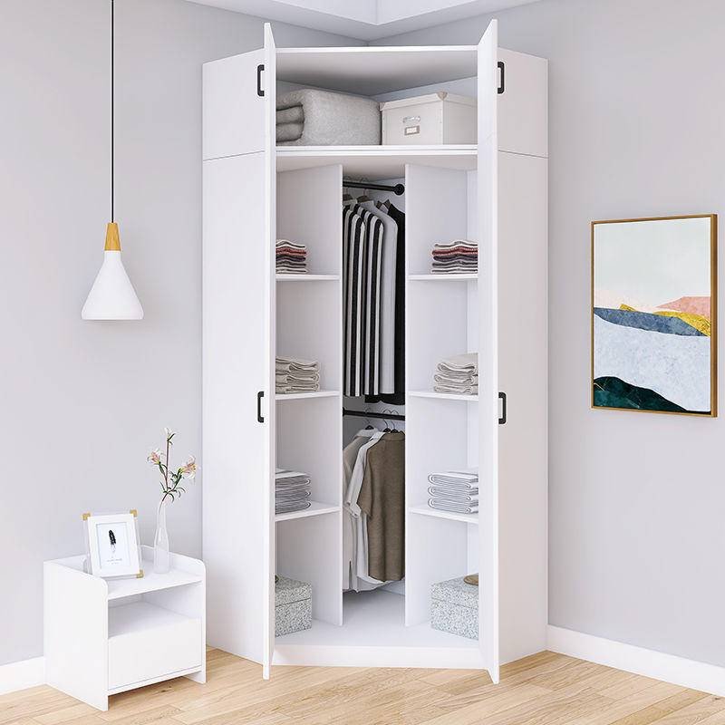 White corner wardrobe closet for small bedrooms with hanging rods and drawers