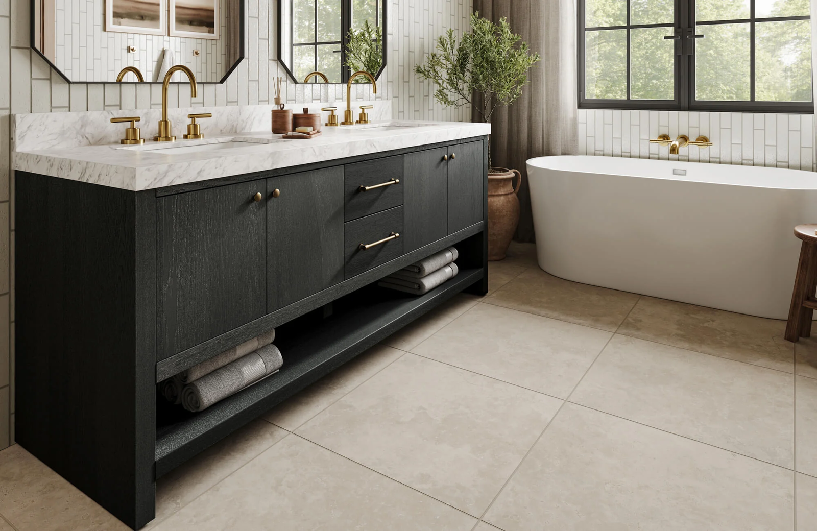 This luxury double sink bathroom vanity with open shelf is designed for buyers who want both elegant appearance and practical daily storage. Inspired by modern hotel bathrooms and high-end residential interiors, this freestanding vanity combines a refined black wood finish, bright marble-look countertop, and warm metallic accents to create a clean and upscale bathroom statement.