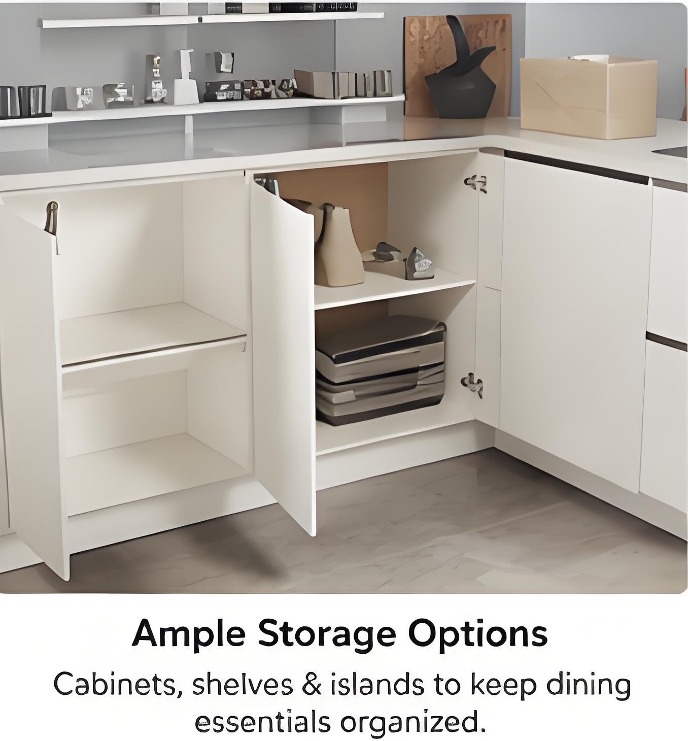 For integrated dining-storage layouts, confirm the countertop and cabinet depth so traffic flow remains comfortable in open-plan spaces.