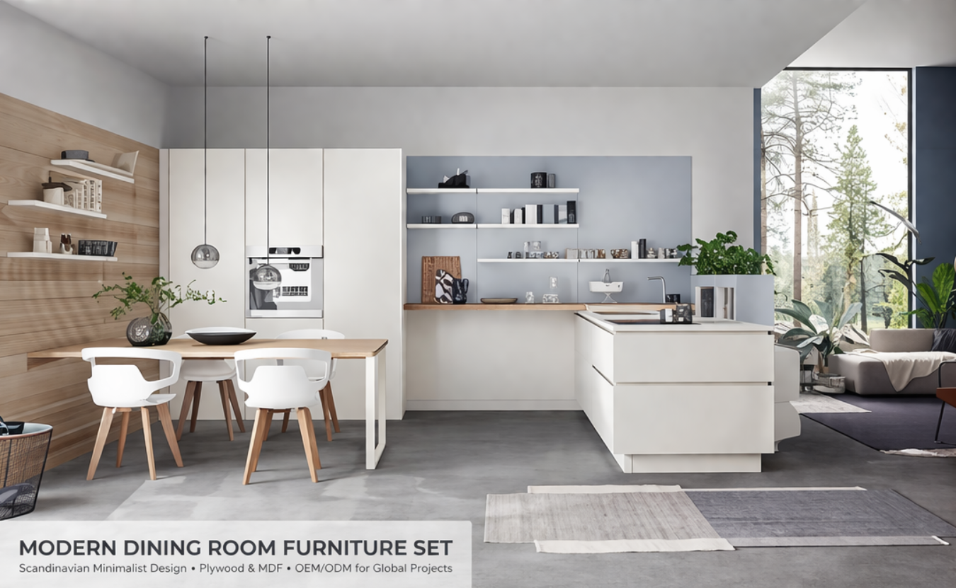 A modern apartment dining furniture set designed for open-plan living, built in plywood, MDF, or OSB with RTA structure, soft-close hardware, custom sizing, and bulk-order support for residential and hospitality projects.