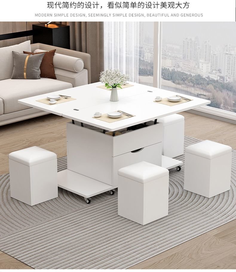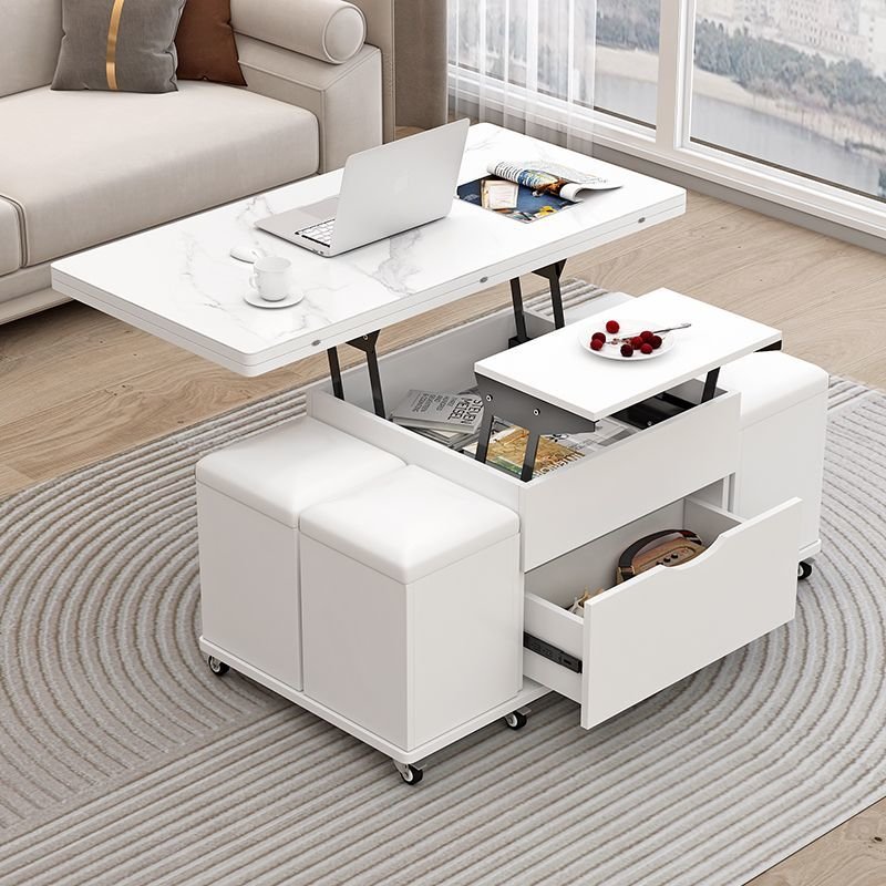 The space-saving lift top coffee table with storage is a clever solution for modern living spaces where every square meter counts. It seamlessly transforms from a low coffee table into a higher work or dining surface, while hidden storage inside the table keeps your living room clean and organized.