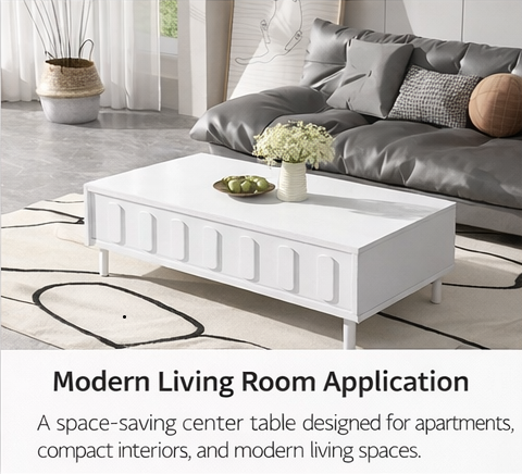 This white lift top coffee table with drawers is suitable for apartment furniture programs, online retail, wholesalers, and interior furnishing projects.
