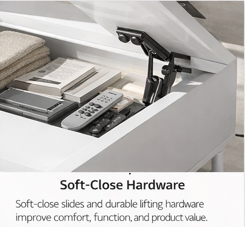 | Hardware | Soft-close drawer slides, lift-top mechanism |