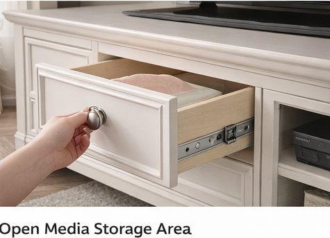 A balanced combination of drawers, shelves, and closed compartments keeps media devices, remotes, books, and accessories neatly organized.