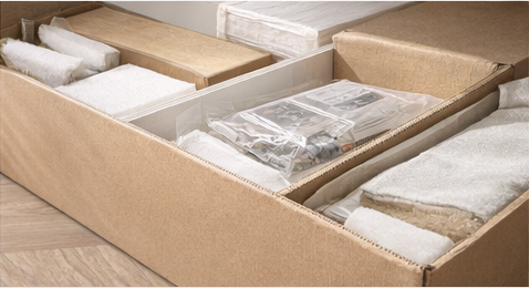 Protection: corner guard, foam, panel separation, hardware kit bag, assembly instruction support